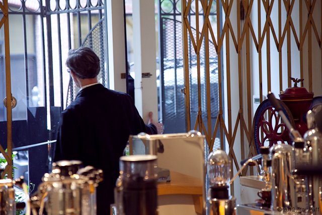 Tucked discreetly behind some iron gate work on the shady side of the street, I nearly ran by the shop. Across the gate in gold letters was spelled out Thos. E. Cara, Ltd. Unlike typical store frontage, nothing grabbed my attention or even attempted to pull me in. Forget the seduction of foot traffic; clearly this was a shop for the intentional customer. Just within the gate, a sidewalk mosaic of a large copper espresso machine suggested the destination. It was a message of exclusivity, maybe even exclusion, a clue to a riddle you need to be looking to solve.