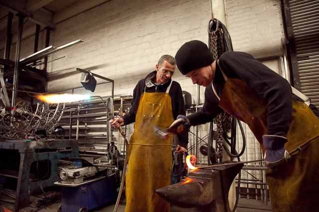 Back at the foundry, Carlos spends time on one of his paid projects, a multi-faceted free-standing trellis for an estate in the suburbs. I’m struck with the elegant simplicity of the design, spirals and florets intertwining in intricate combinations. The proportions are just right, it seems. This is the kind of project that pays the bills, and by bringing revenue from the affluent suburbs into metro Detroit, makes CAN Art Handworks an exception to the trend of the past few decades. On this job, Carlos has Eric on the payroll. Eric is a 24 year-old sculptor with a fascination for metalwork, and has been learning the craft for a few years. Eric tells me in confidence that no one he’s met– in Detroit or New York– has the skills Carlos possesses, and he’s fortunate to learn from a master. Also on hand is a young man from the neighborhood, ShiRay. Learning from Eric, he’s just beginning an exploration of the craft. Carlos tells me (in confidence), that both kids have the core to become excellent, and for that he’s thankful to have them around.